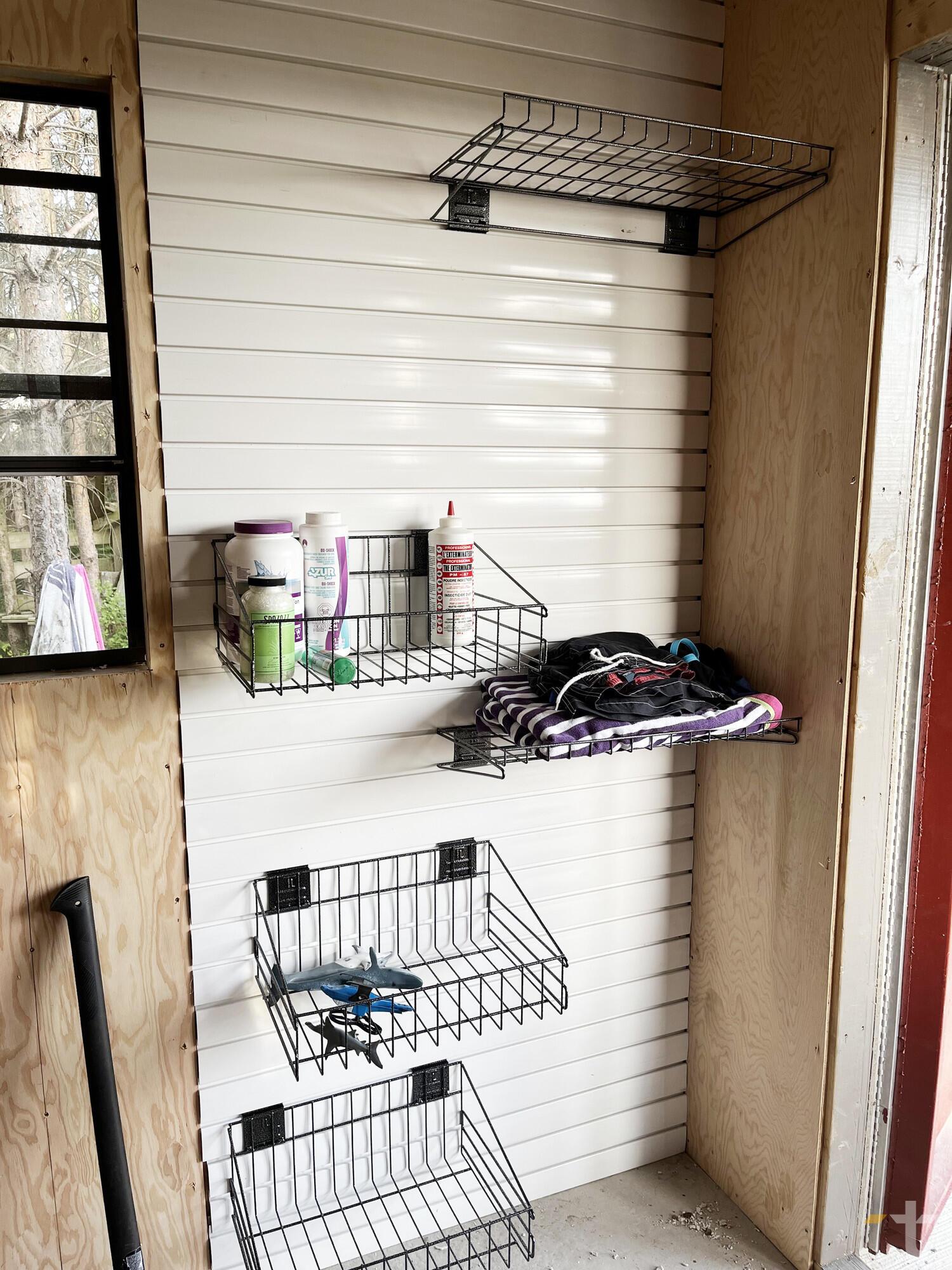 Trusscore offers several SlatWall hardware options — including hooks, baskets, and shelves — that snap into place and can be easily moved around as your storage needs change.