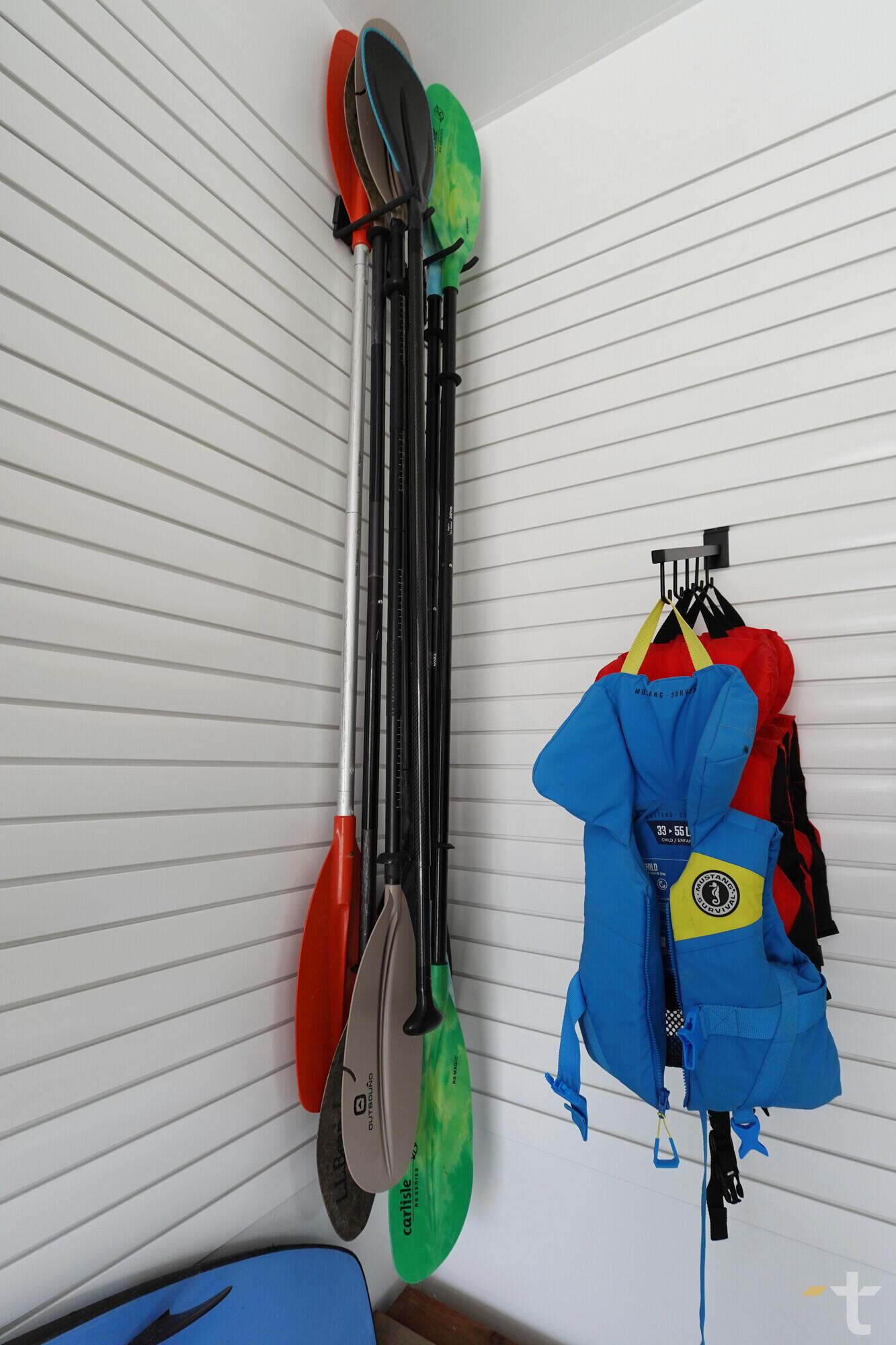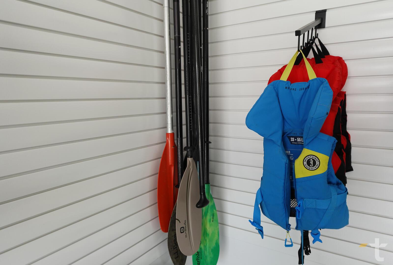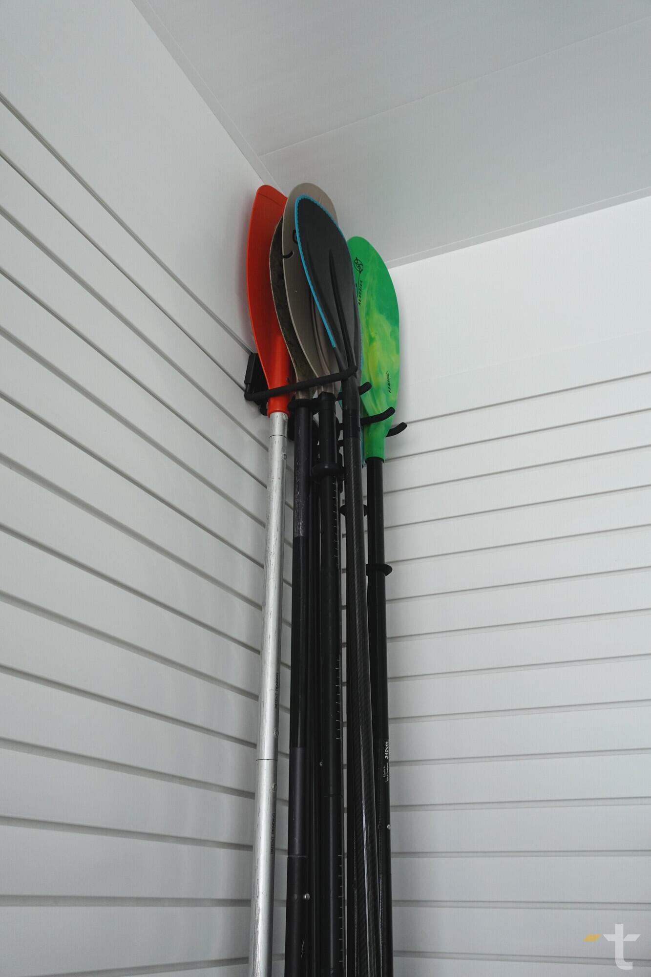 Trusscore offers several SlatWall hardware options — including hooks, baskets, and shelves — that snap into place and can be easily moved around as your storage needs change.