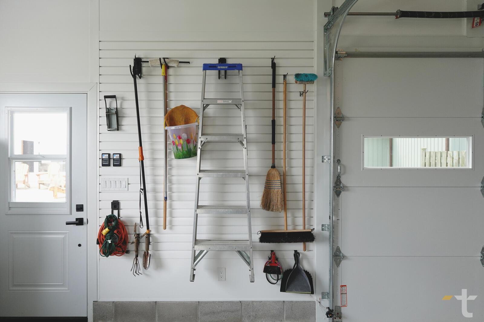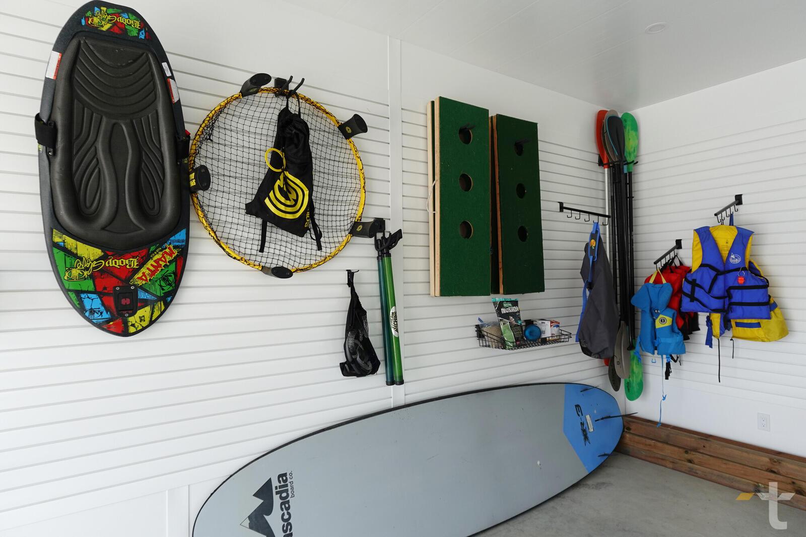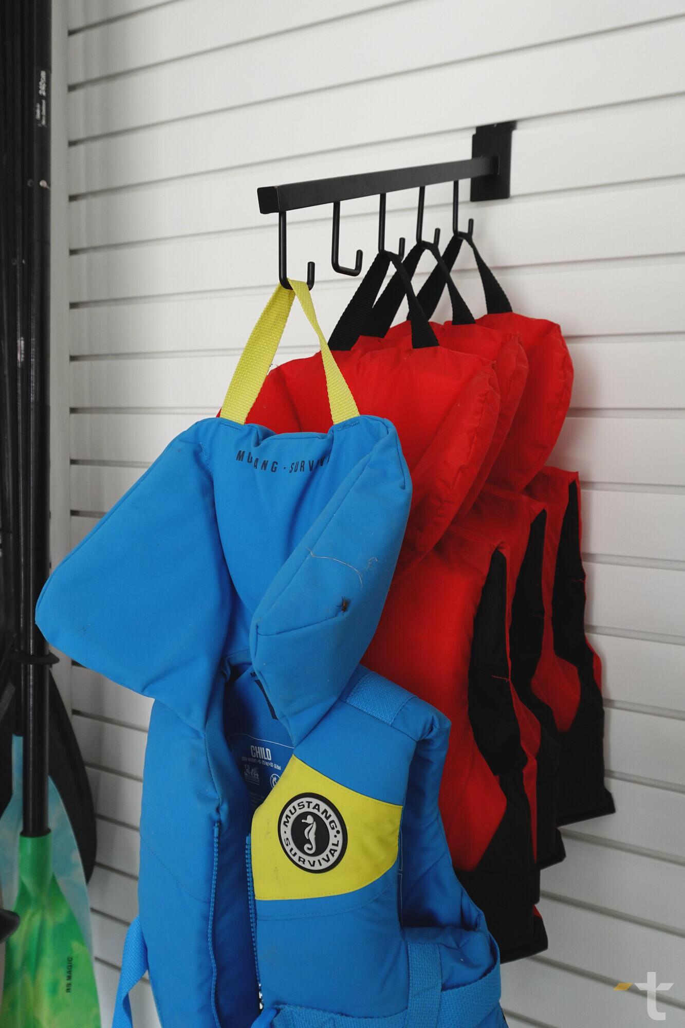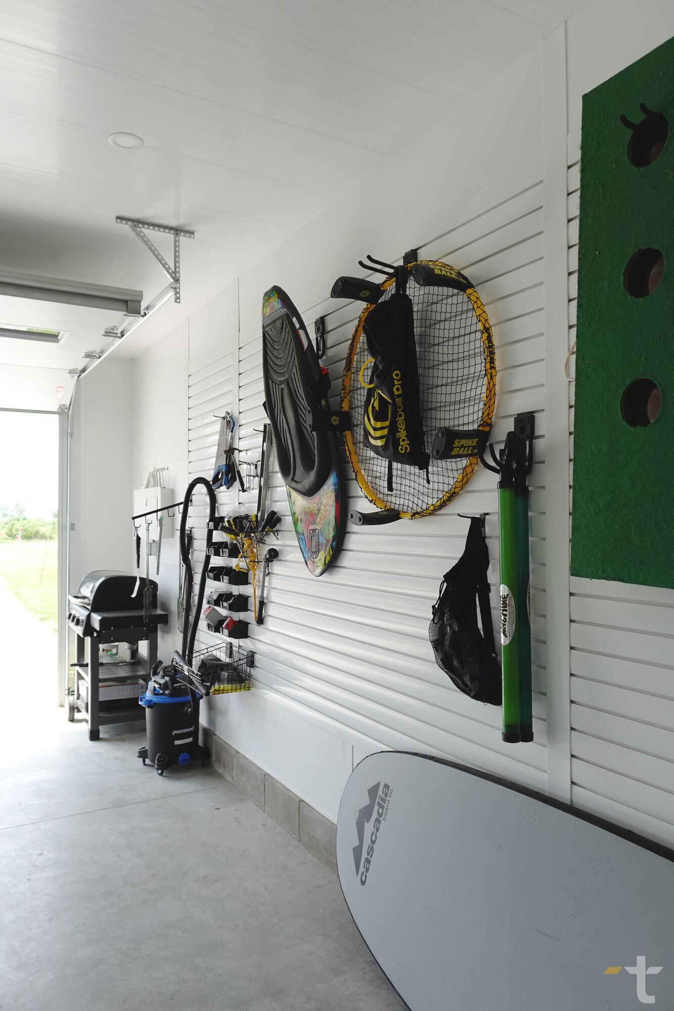 Trusscore offers several SlatWall hardware options — including hooks, baskets, and shelves — that snap into place and can be easily moved around as your storage needs change.