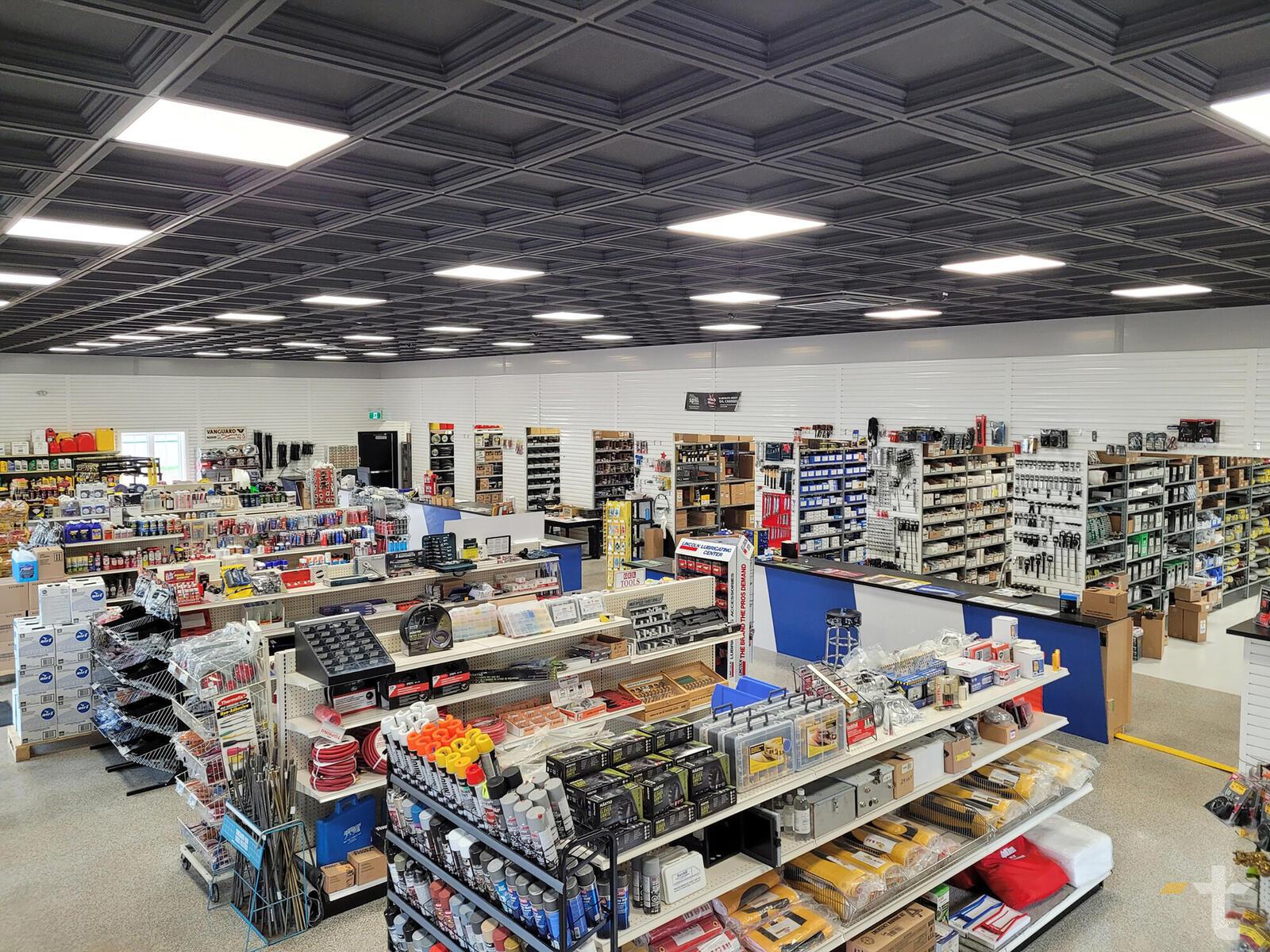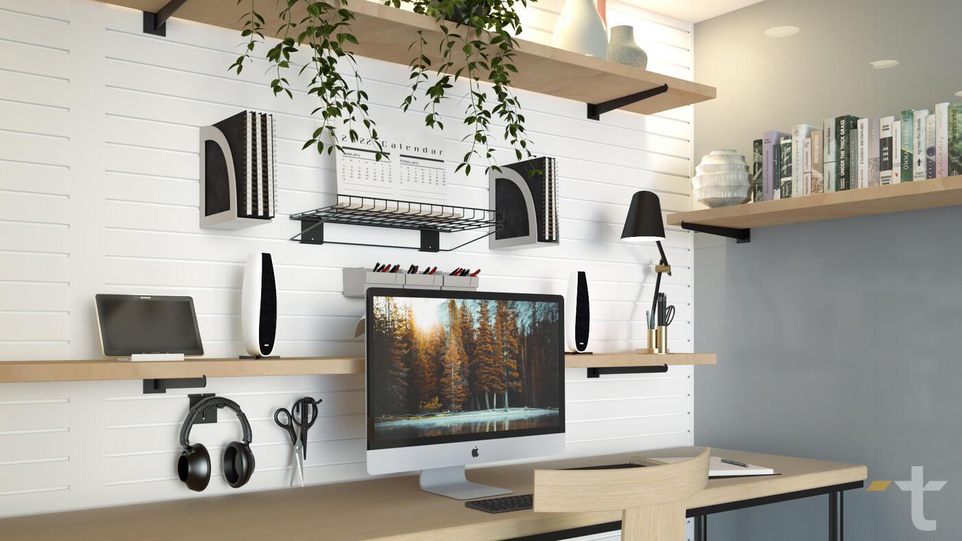 Wall&CeilingBoard combines with Trusscore SlatWall to transform office walls into convenient, tidy, storage solutions suitable for hanging baskets, shelves and hooks.