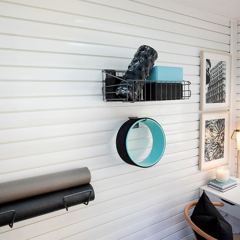 Backyard Shed Oasis: In this backyard transformation, Seb created a versatile Shipping Container Studio. This studio served dual purposes: a quiet retreat for yoga practice and a functional space for running a photography business. The studio was finished with Trusscore SlatWall, which provided a bright, easy-to-clean surface and design versatility to meet both needs. The clean and bright appearance of the Trusscore panels helped create a serene and organized environment, perfect for relaxation and creativity.