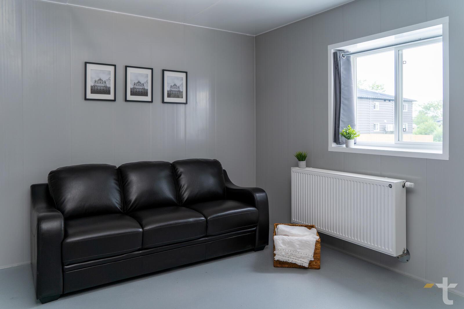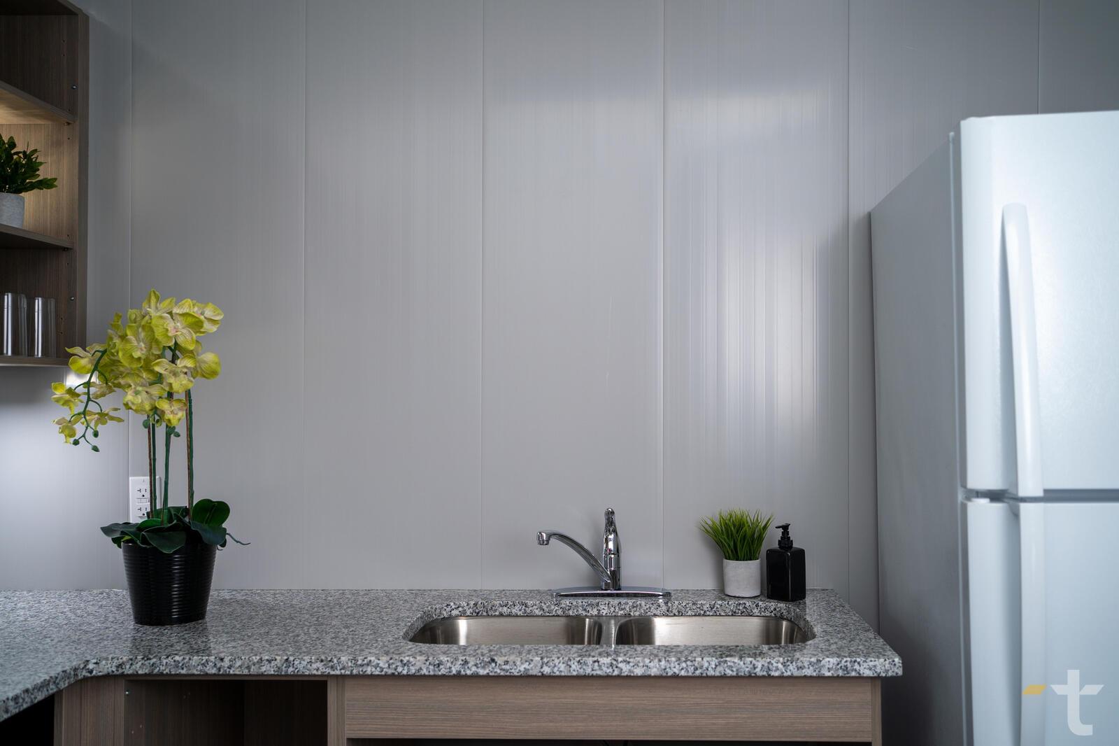 Trusscore Wall&CeilingBoard has been used throughout. As an interior design element, gray Wall&CeilingBoard was built into the design of each apartment, creating a warm, comfortable, and welcoming space for migrant workers while still maintaining the durability, cleanability, and hygiene of the surface of the walls and ceilings.