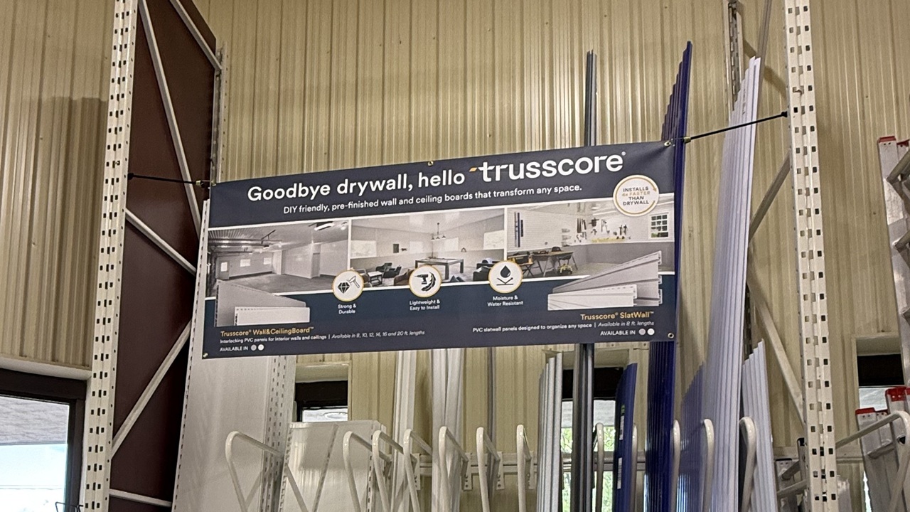 A Trusscore Wall Board Display helps advertise that your store sells Trusscore and provides details for the most commonly used products.