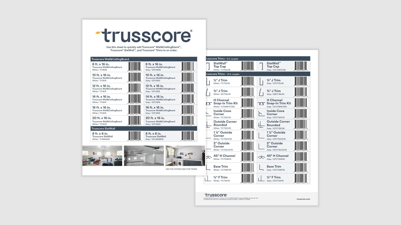 This UPC sheet helps retailers quickly add Trusscore Wall&CeilingBoard, Trusscore SlatWall, and Trusscore Trims to an order.